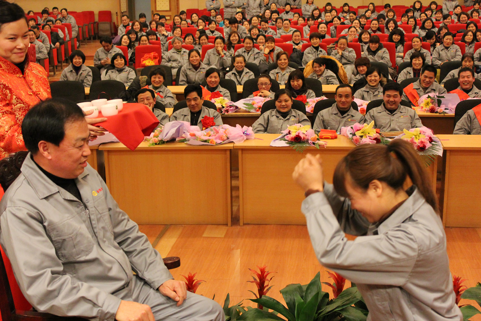 2012年1月19日下午,在金元宝大酒店国际会议中心金箔公司六名“幸运儿”:葛才金、石加宏、顾青、陈新华、陈平、王冬平逐一向中国金箔锻制第三代传承人梅正华师父单膝跪地、三鞠躬,“一拜:感谢师父日后辛勤指导;再拜:发奋努力、共创佳绩;三拜:薪火传承、振兴金箔”。并一一给师父奉茶,表达尊师、敬师之情意,集体向师父行礼致敬。在接过梅正华的红包后,六位打箔技师正式成为金箔技艺第四代传承人,王东平幸运的成为唯一一名女弟子。仪式上,师父梅正华立即给弟子们上了一堂课,提出“四字”要求:“会、懂、专、精”。“会、懂”不难,但是“专、精”很重要,学手艺不看学历高低,需要的是能吃苦,有悟性。希望徒弟们在提高技艺的同时,还能注重技艺的传承,延续传统金箔工艺的传承体系。