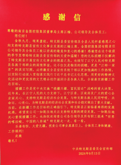 一份感谢,凝聚万缕亲情;一面锦旗,承载浓浓真情。江宁区自2010年开始,根据中央新一轮援疆工作部署,对口支援伊犁特克斯县。援疆的纽带让江宁与特克斯紧密“牵手”,为两地架起了一座友谊与合作的桥梁,不仅促进了特克斯县的经济社会发展,也加深了两地人民之间的深厚情谊。金箔拼搏(中国)积极参与对口支援活动,对特克斯县十多年来的传承援助,不仅仅是物质的捐赠,更是“江”“特”一家亲的真实写照,也赢得特克斯县人民广泛赞誉,进一步增强了两地之间的友好合作关系。